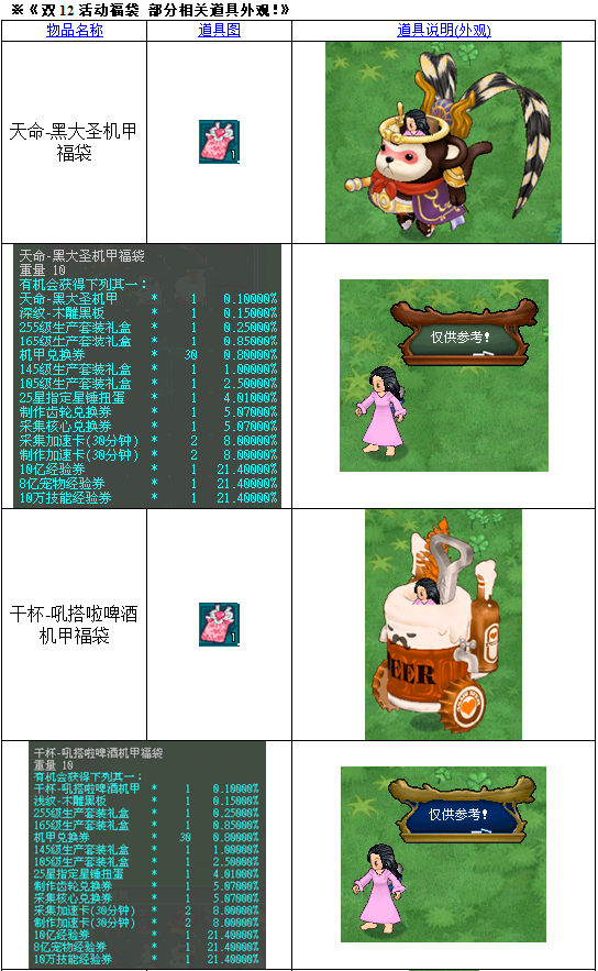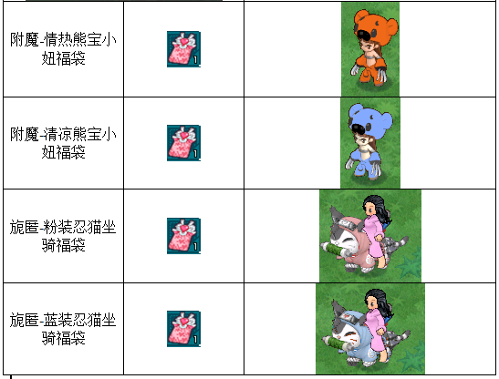 『天命-黑大圣机甲福袋』、『干杯-吼搭啦啤酒机甲福袋』、『附魔-情热熊宝小妞福袋』、『附魔-清凉熊宝小妞福袋』、『旎匿-粉装忍猫坐骑福袋』。