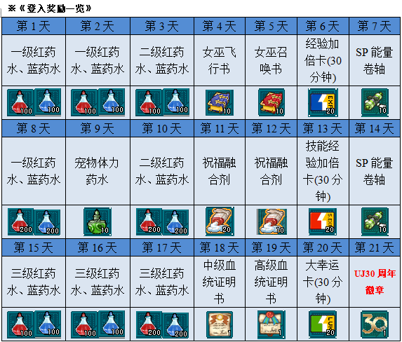 (2)活动期间内累积登入即可会得各式好礼,累积满21天后更可获得联名限定徽章『UJ30周年徽章』。小天使可在天使乐园(173,93)找到『博爱天使菲列』NPC进行签到