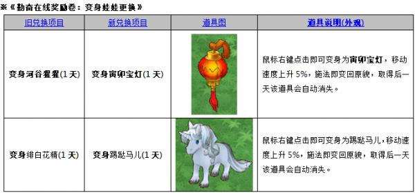◾勤奋在线奖励卷:变身娃娃更换 变身河谷星星(1天)➔变身寅卯宝灯(1天) 变身绯白花精(1天)➔变身踢跶马儿(1天)