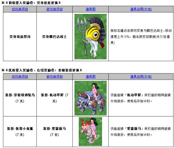 ◾优质登入奖励卷、在线奖励卷:坐骑装扮更换 装扮-穿梭绿洲鸵鸟(7天)➔装扮-机动甲犀(7天) 装扮-狡猾小鬼狐(7天)➔装扮-紫露薇马(7天)