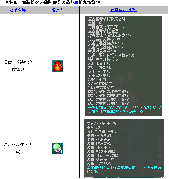 1.新增:天使商城抢购区新增『复古座骑装扮欢庆福袋』、『怀旧座骑装扮欢庆福袋』重新上架。 (1)活动时间:2021/09/30(四)至2021/10/07(四)关机维护前,共一周。 ※期间购买赠送『暮秋秘境入场6小时券』1张。