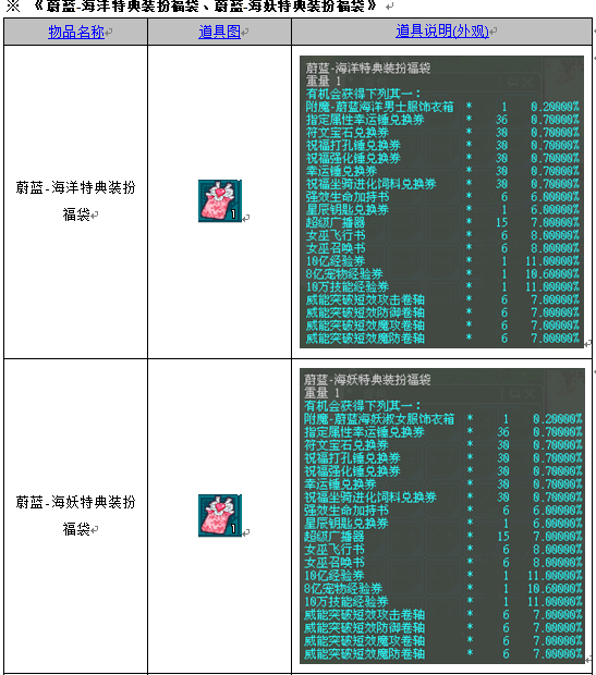 (3) 『蔚蓝-海妖特典装扮福袋』内的『附魔-蔚蓝海妖淑女服饰衣箱』,服饰限制皆为女性,武器附魔则为通用。