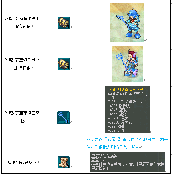 (2) 『蔚蓝-海洋特典装扮福袋』内的『附魔-蔚蓝海洋男士服饰衣箱』,服饰限制皆为男性,武器附魔则为通用。