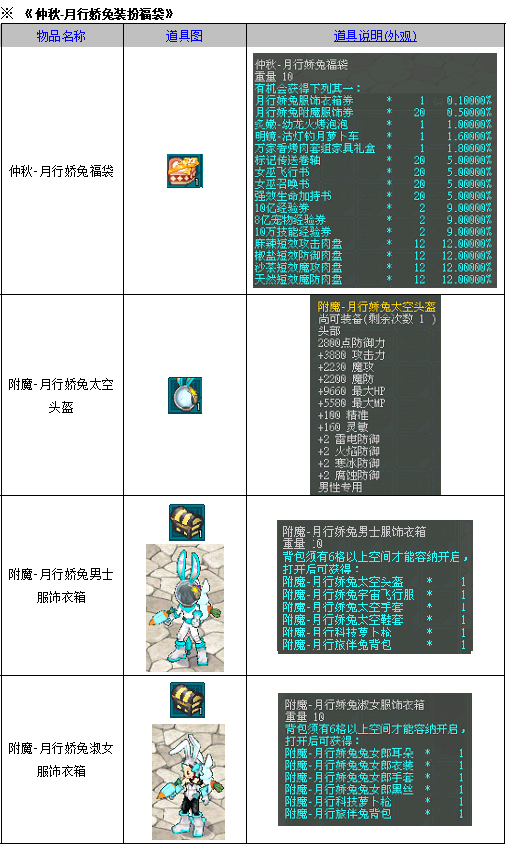 (2) 『仲秋-月行娇兔福袋』中包含『月行娇兔服饰衣箱券』、『月行娇兔附魔服饰券』。