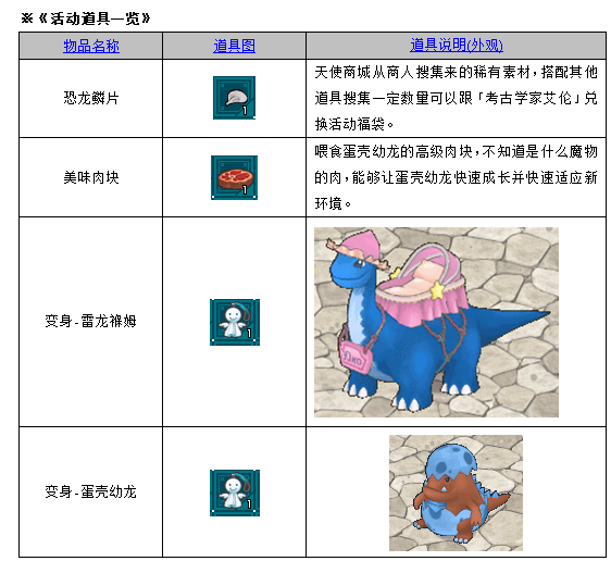 (6)参与活动可另外获取任务道具『恐龙蛋壳』『幼龙蜕皮』搜集一定数量可获得指定成就,全部完成可再额外获得最终成就与封号,于全部成就获得后,可继续进行兑换奖励,后续随故事进度会接续开放活动奖励道具的兑换。